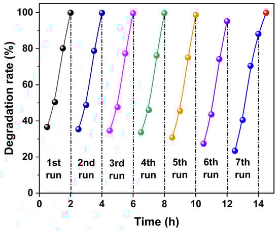 After the first degradation and magnetic separation, the Fe3O4 particles were mixed with 100 mL of 10 mg/L dye solution and 1.0 mL of H2O2 and illuminated by UV light illumination for 2 h under continuous stirring, during which about 10 mL suspension was taken every 0.5 h to obtain the residual dye solution through magnetic separation. Subsequently, all the removed catalyst and dye solution were reintroduced into the reaction system after testing its absorbance.