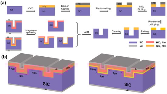 The sample preparation process is shown in Figure 1a. Firstly, a uniform SiO2 film was deposited on the surface of an n-type 4° off-angle silicon face (0001) 4H-SiC epitaxial wafer by chemical vapor deposition (CVD) to form a masking layer. Following the application of a photoresist, photolithography was used to pattern the SiO2 masking layer and define the target trench structure. The photolithography process involved exposure and development processes to create precise patterns on the mask layer, followed by controlling subsequent etching steps to ensure accurate trench dimensions and shapes. The trench structure was aligned along the crystallographic phase of the SiC substrate. After etching the SiO2 masking layer, the photoresist was stripped, and the SiC etching was performed to form the desired trench structure. Next, buffered oxide etch (BOE) technology was used to remove the unprotected areas of the masking layer to form the trench structure. The obtained trench possessed a width of 3 µm, a depth of 1.5 µm, and a spacing of 5 µm, providing a precise structural base for the subsequent thin film deposition. After completion of the trench structure, ALD was employed to uniformly deposit an approximately 40 nm thick gate oxide dielectric layer onto the trench surface. The deposition was performed for 400 cycles at a temperature of 270 °C. TDMAHf and H2O were used as the precursors for Hf and O, respectively, to deposit HfO2 films. In the deposition of SiO2, Bis(diethylamino)silane (BDEAS) was served as the Si precursor, while plasma was used as the O source. The use of ALD technology ensured precise control over the thickness of each layer and guaranteed the formation of a uniform and stable gate oxide layer. Finally, magnetron sputtering was utilized to deposit a 200 nm thick aluminum electrode layer on both the top and bottom sides of the sample. To ensure good electrical performance and stable electrical contact, the front shape of the aluminum electrode was designed as a square with dimensions of 200 µm × 200 µm. The schematic diagrams of the final HfO2 thin film and SiO2/HfO2 bilayer thin film samples are depicted in Figure 1b. This device includes the coexistence of top and trench sidewall dielectric interfaces.