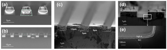 SEM images (a) after SiO2 etching, (b) after SiC etching, (c) of the trench structure after BOE cleaning, (d) after ALD processing, and (e) of magnification of the white-boxed area in (d).