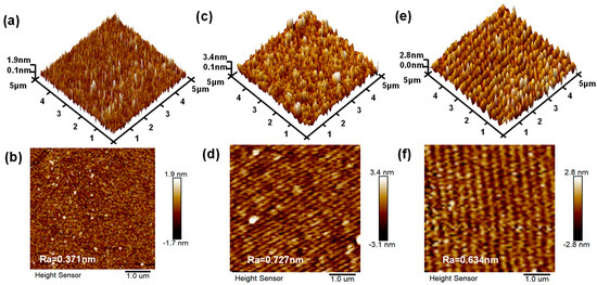 Both 3D and 2D AFM images within the area of 5 × 5 um2 for (a,b) HfO2 and (c,d) SiO2/HfO2, and (e,f) interlayer SiO2.