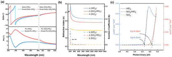 SE results for HfO2 and SiO2/HfO2 samples: (a) Ψ (psi) and Δ (delta) of the measured complex reflectance, (b) fitted refractive index and extinction coefficient, and (c) (αhν)2 parameter versus photon energy for the fitted bandgap.