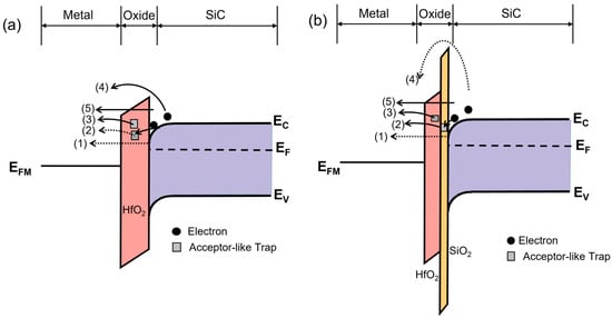 - Cheong, K.Y.; Moon, J.H.; Kim, H.J.; Bahng, W.; Kim, N.K. Current Conduction Mechanisms in Atomic-Layer-Deposited HfO2/Nitrided SiO2 Stacked Gate on 4H Silicon Carbide. J. Appl. Phys. 2008, 103, 084113. [Google Scholar] [CrossRef]