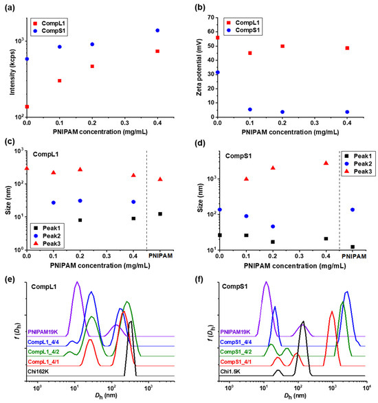 (a) Scattered intensity, (b) zeta potential, and (c,d) peak sizes, derived from the corresponding (e,f) size distributions, for the CompL1 and CompS1 series of complexes. Also included for comparison, the size distributions for the Chi162K, Chi1.5K, and PNIPAM19K samples.
