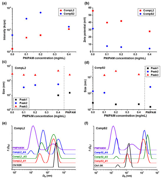 (a) Scattered intensity, (b) zeta potential, and (c,d) peak sizes, derived from the corresponding (e,f) size distributions, for the CompL2 and CompS2 series of complexes. Also included for comparison, the size distributions for the Chi162K, Chi1.5K, and PNIPAM3K samples.