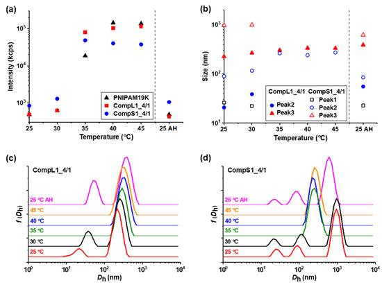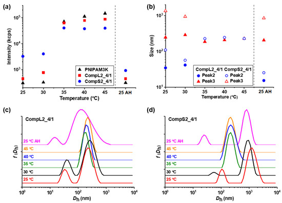 Figure 7a and Figure 8a reveal the influence of temperature on the scattered intensity for the representative complexes of both chitosan samples at a 4/1 volume ratio in comparison to the corresponding PNIPAM samples. At 35 °C (i.e., above the LCST of PNIPAM) an abrupt increase in intensity accompanied by a significant increase in turbidity was observed for all samples. This behavior is characteristic of the thermal phase transition of PNIPAM, and was attributed to the increase in the hydrophobic interactions that induce interchain aggregation and was common for all investigated samples of Chi/PNIPAM complexes (see also Figures S10–S13a). Further increases in temperature up to 45 °C seemed to have no significant effect on the scattered intensity, while the initial values were fully restored upon returning to 25 °C, showcasing the reversibility of the transition. At the same time, the corresponding size distributions for the 4/1 complexes of all four systems (Figure 7c,d and Figure 8c,d) exhibited the same transition from two or three peaks to only one above 35 °C, which was also a characteristic trait of both PNIPAM samples (see Figure S14). This behavior suggests the aggregation of the initial populations of complexes into single compact structures, owing to the increase in the hydrophobicity of the complexed PNIPAM chains, which in turn favors interchain interactions. The sizes of these thermally induced aggregates seems to have some correlation to the conformation of the initial complexes. In particular, for the complexes of the long chitosan molecules (CompL1or2_4/1), the species detected above 35 °C had a similar size to the corresponding initial larger populations, while in the case of the short chitosan complexes, intermediate sizes (in comparison to the initial populations) were observed for the aggregates formed as a result of the thermal transition. This fact could mean that the looser conformation of the complexes formed with the long chitosan hindered, to some degree, the inter-chain PNIPAM interactions, thus retaining more or less their initial structure upon heating. On the contrary, the complexes of the short chitosan already had a more dense/compact conformation that facilitated to a greater extent the thermally induced PNIPAM interactions, leading to further increases in their compactness. Similar thermal transitions were observed for the rest of the Chi/PNIPAM complexes (see Figures S10–S13), with the only difference worth mentioning being those observed for the sizes of the CompLorS2_4/4 samples (Figure S13). In this case, the long chitosan complexes seemed to become more compact upon heating, while those of the short chitosan maintained their size. Apparently, as the PNIPAM content increased, the inter-chain interactions became more dominant and even the relatively loose initial (i.e., before heating) conformation of the CompL2 complexes collapsed, while the already too-compact structure of the CompS2 ones did not allow for additional reduction in their size. Nevertheless, after the solutions were cooled back to room temperature, they all returned to their initial state, again verifying the reversibility of the systems.