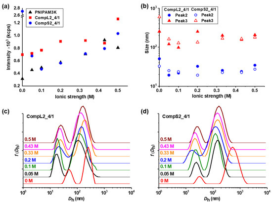 In general, Figure 9 and Figure 10 reveal analogous changes in both the intensity and the individual sizes for the complexes corresponding to the same PNIPAM sample. In more detail, CompL1or2_4/1 samples exhibited a slight gradual increase in intensity as a function of ionic strength, while the size of both populations decreased upon the initial addition of salt (0.05 M) up to 0.1 M, but it remained rather unaffected by the further increase in ionic strength. This combination of events could possibly mean that the complexes shrink or collapse as a result of the occurring charge screening and the parallel reduction in electrostatic repulsions brought on by the increase in ionic strength. In this way, a reduction in their size and, at the same time, an increase in their scattered intensity as they become more compact/dense (possibly followed by an increase in their mass) was observed. In parallel, CompS1or2_4/1 samples exhibited a comparable transition in sizes, while the scattered intensity initially (up to 0.1 M) decreased either slightly, in the case of CompS1, or significantly, for CompS2. Therefore, it can be assumed that for the complexes formed with the short chitosan molecules, the initial increase in ionic strength and the consequent charge screening resulted in some partial disassembly of the aggregated secondary complexes. Nevertheless, upon further increase in ionic strength (0.2–0.5 M), no significant changes were observed.
