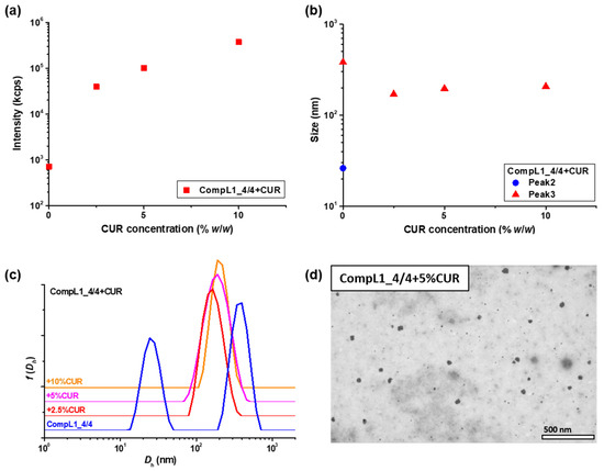 DLS results in regard to the (a) scattered intensity and (b) peak sizes, derived from the corresponding (c) size distributions, for the CUR-loaded CompL1_4/4 samples, along with (d) a representative STEM image for the CompL1_4/4 + 5%CUR sample (the scale bar corresponds to 500 nm).