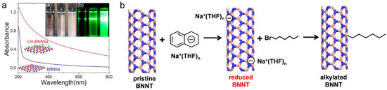 (a) UV-Vis spectra of pristine BNNSs and OH-BNNSs in water, with the inset showing photographs of water, and pristine BNNSs and OH-BNNSs in water [53]. (b) Schematic illustration of the covalent alkylation of reduced BN nanotubes using 1-bromohexane [54].