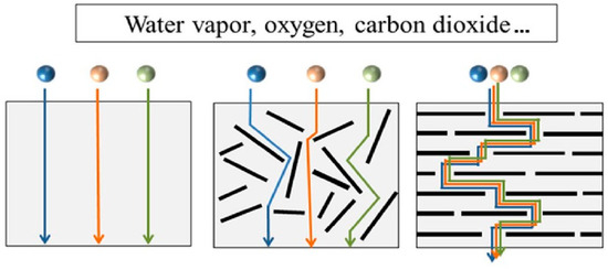 One of the most significant advantages of 2D materials is their high aspect ratio and large surface area, which facilitate effective dispersion within polymer matrices. When integrated into polymer films, nanosized fillers establish a convoluted pathway for the diffusion of gases and moisture, thanks to the impermeable inorganic crystals present in the fillers (Figure 8). An increase in the stacking degree of the plate-like nanoparticles enhances barrier effectiveness by creating a more convoluted pathway within the polymer matrix. The colloidal interactions between the 2D materials and the polymer matrix contribute to a strong interface. Colloidal stability is essential for the successful integration of these materials. Stable dispersions ensure uniform distribution throughout the matrix, which is critical for consistent barrier performance.