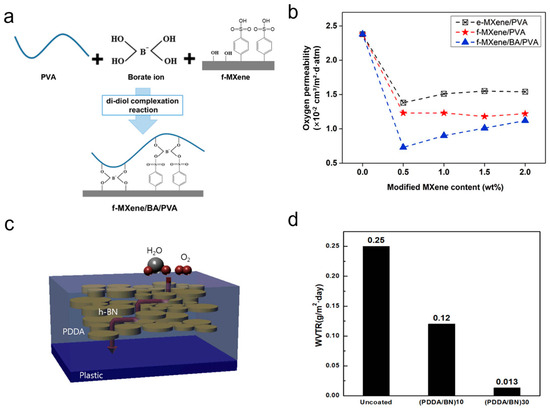 In addition, other 2D materials, such as h-BN and MoS2, offer new options for improving the barrier properties of composite films [81]. Electrostatic coupling of hydroxylated h-BN with a cationic polymer of polydiallyldimethylammonium chloride (PDDA) forms hydroxyl-functionalized h-BN/PDDA nanocomposites (Figure 10c). The well-dispersed and highly ordered h-BN nanosheets can reduce the water vapor transmission rate to 1.3 × 10−2 g m−2 d−1 (Figure 10d). The hydroxylated MoS2 was uniformly incorporated into polyvinyl alcohol. The helium permeability of the obtained films decreased from 169 × 10−17 mol m−1 s−1 Pa−1 to 1.8 × 10−17 mol m−1 s−1 Pa−1, indicating that the addition of hydroxyl functional group MoS2 significantly improved the gas resistance of the films.