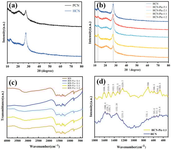 (a) XRD pattern of PCN and HCN; (b) XRD pattern of HCN and different additional amounts of Pic; (c) FT-IR spectra of HCN and different additional amounts of Pic; (d) Raman spectra of HCN and HCN-Pic-1:1.