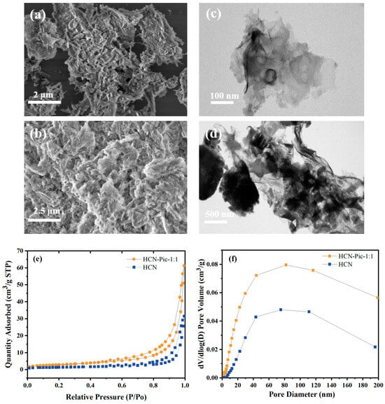 (a) SEM images of HCN; (b) SEM images of HCN-Pic-1:1; (c) TEM images of HCN; (d) TEM images of HCN-Pic-1:1; (e) nitrogen adsorption–desorption isotherm of HCN and HCN-Pic-1:1; (f) pore size distributions of HCN and HCN-Pic-1:1.