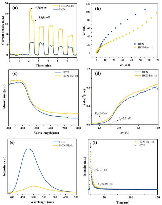 (a) Transient photocurrent curves under the visible light; (b) EIS Nyquist plots; (c) UV–vis DRS; (d) plots of (αhν)2 versus (hν); (e) PL spectra; (f) TR-PL decay curves of HCN and HCN-Pic-1:1 samples.