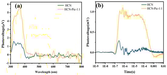 (a) Surface photovoltage (SPV) spectra; (b) transient-state surface photovoltage (TPV) spectra of HCN and HCN-Pic-1:1 samples.