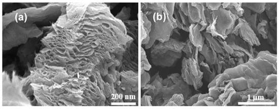 A detailed comparison between the SEM images of GO and rGO was conducted, as shown in Figure 2. The morphology of GO appeared as layered nanoplates adhering to one another. The graphene oxide image (Figure 2a) reveals stacked structures, indicating that exfoliation of graphite had taken place. The SEM analysis further demonstrated that GO particles contain high-volume pores forming a “mesh-like” structure, which could serve as a macroscopic arrangement of aligned graphene sheets. This structure has many potential applications, including strong fiber production, functional textiles, field-emission displays, and energy storage [22]. However, since the objective of this study was to obtain a hydrophobic material, GO was reduced using hydrazine hydrate before further processing. The SEM image in Figure 2b displays noticeable wrinkles and crumples on the rGO surface. Wrinkling is a typical characteristic of 2D materials and is primarily caused by the negative thermal expansion of rGO [23,24,25,26,27]. Additionally, the crumpled structures resemble “paper-ball-like” formations, which resulted from isotropic compression and the thermal reduction process of the nanomaterial [25].