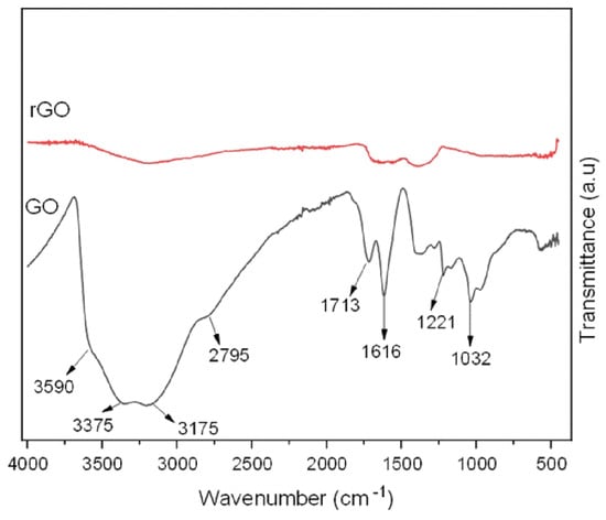 Fourier-transform infrared (FTIR) spectroscopy was used to identify the functional groups in GO and validate its oxidation process, as shown in the spectrum in Figure 3. The key absorption bands included a broad peak between 3590 and 2500 cm−1, associated with carboxyl O-H stretching; an O-H stretching peak around 3375 cm−1, attributed to adsorbed water and alcohol groups; a peak at 1616 cm−1 corresponding to C=C stretching in unoxidized graphitic regions; a C=O stretching peak at 1713 cm−1 from carboxyl groups; a 1221 cm−1 peak for C-OH stretching in alcohols; and a peak at 1032 cm−1, signifying C-O-C stretching. After reduction with hydrazine hydrate, the rGO’s FTIR spectrum exhibited a significant decrease in intensity and the peaks related to oxygen-containing groups disappeared, confirming successful reduction while suggesting that some functional groups remained [26].