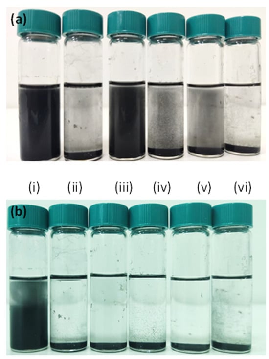 Stability of rGO in different solvents, with (a) representing the initial dispersion and (b) showing the sedimentation and aggregation after 24 h. From left to right: ethanol, toluene, methanol, dichloroethane, acetone, and hexane.