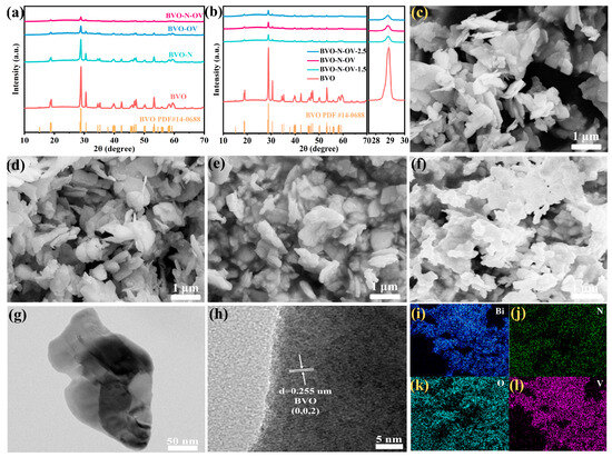 Scheme 1 depicts the preparation method of the dual defect-engineered BiVO4 nanosheet photocatalyst. Initially, BiVO4 nanosheets were prepared through a hydrothermal process. Subsequently, the dual defect-engineered BiVO4 nanosheets were obtained by annealing the BiVO4 nanosheets with ammonium oxalate assistance. For comparison, N-doped BiVO4 nanosheets were prepared by annealing the BiVO4 nanosheets in an NH3 atmosphere. Meanwhile, oxygen vacancy-rich BiVO4 nanosheets were synthesized by oxalate-assisted annealing of BiVO4 nanosheets in an inert atmosphere. The X-ray diffraction (XRD) patterns of the synthesized BVO-N-OV, BVO, BVO-N, and BVO-OV samples well matched with monoclinic BiVO4 (JCPDS: 14-0688) (Figure 1a) [36]. In the XRD patterns of the obtained materials, no additional diffraction peaks other than those of BiVO4 were observed, indicating the high purity of the synthesized samples. In addition, as the amount of N doping increases, the XRD diffraction peak corresponding to the (121) plane at 28.9° gradually shifted (Figure 1b), indicating that N atoms were successfully integrated into the BiVO4 lattice or substituted O atoms [37]. Scanning electron microscope (SEM) images revealed that the pristine BiVO4 displayed a thin, smooth-surfaced nanosheet morphology (Figure 1c). After introducing N doping and oxygen vacancy defects, the morphology and dimension of the BiVO4 nanosheets remained largely unchanged (Figure 1d-f). In addition, transmission electron microscope (TEM) and high-resolution TEM (HR-TEM) images (Figure 1g,h) further validated the nanosheet morphology of the dual defect-engineered BiVO4. The lattice fringe spacing of 0.255 nm aligns with the (002) plane of monoclinic BiVO4. The lattice spacing value of the (002) crystal plane of the dual defect-engineered BiVO4 nanosheets was similar to that of the pristine BiVO4, likely due to the similar radii of N atoms (0.75 Å) and O atoms (0.73 Å). In addition, as shown in Figure 1i–l and Figure S1, EDX element mapping confirmed N incorporation and indicated that N, O, Bi, and V elements were uniformly spread across both BVO-N and BVO-N-OV.