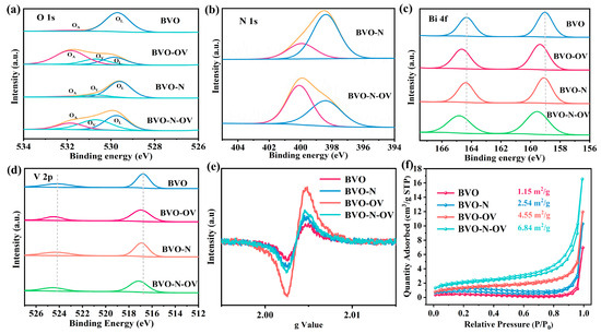 XPS spectra of BVO, BVO-OV, BVO-N, BVO-N-OV (a) O 1s; (b) N 1s; (c) Bi 4f; (d) V 2p; (e) EPR spectra; (f) N2 adsorption-desorption isotherms of BVO, BVO-N, BVO-OV and BVO-N-OV.