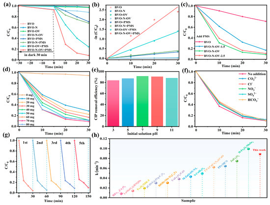 (a,c) CIP degradation experiments and (b) kinetic profile image in different systems. Reaction conditions: catalyst dosage: 10 mg, PMS dosage:60 mg, [CIP] = 20 ppm, [pH]0 = 6.5. The removal rate of CIP in different conditions, (d) PMS dosage; (e) solution pH; (f) the presence of inorganic anions. (g) Removal rate of CIP by 5 cycles of BVO-N-OV catalyst; (h) Comparison of the degradation rate of CIP under visible light for BVO-N-OV and other materials.