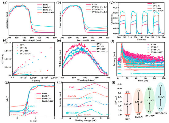 UV–vis absorption spectra of (a) BVO, BVO-N, BVO-OV and BVO-N-OV; (b) BVO and BVO-N-OV-1.5, BVO-N-OV, BVO-N-OV-2.5; (c) Transient photocurrent response; (d) EIS; (e) PL spectra; (f) TRPL spectra; (g) band gap energy; (h) VB-XPS spectra; (i) band structures of BVO, BVO-N, BVO-OV and BVO-N-OV.