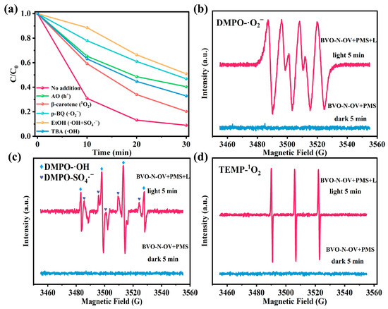 (a) Effect of scavengers on CIP degradation in the BVO-N-OV/PMS/Vis system; EPR spectra of (b) DMPO-•O2−, (c) DMPO-•OH/SO4•−, and (d) TEMP-1O2 adducts obtained for BVO-N-OV and PMS under darkness and irradiation.