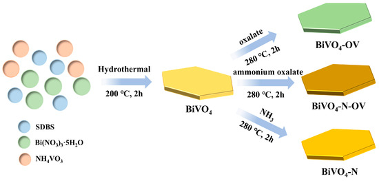 Preparation of BiVO4-N-OV: Completely mixed 100 mg of the original BiVO4 nanosheets with 170 mg of ammonium oxalate monohydrate. The mixture was placed in a muffle furnace and heated to 280 °C at a rate of 2 °C/min, then maintained at 280 °C for 1.5 h, 2 h, and 2.5 h, respectively. Subsequently, the samples were washed with anhydrous ethanol to eliminate any remaining impurities. Lastly, the samples were vacuum-dried at 60 °C for 8 h until completely dry.