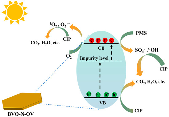 To investigate the carrier migration behavior of the BVO-N-OV photocatalyst and the PMS activation pathway and reveal the CIP degradation mechanism, active species trapping tests were carried out to identify the primary reactive species in the CIP degradation process. As shown in Figure 5a, when ethanol (EtOH) and tert-butyl alcohol (TBA) were added as SO4•− and •OH scavengers into the BVO-N-OV/PMS/Vis system [8,44], CIP removal rate dropped from 91% to 50% and 70%, respectively. This suggested that SO4•− and •OH were crucial in the CIP degradation. When β-carotene and p-benzoquinone (p-BQ) were introduced as scavengers for 1O2 and •O2−, the CIP removal rate dropped from 91% to 80% and 56%, respectively. This highlighted the crucial role of 1O2 and •O2− in the CIP removal process, with •O2− having a more significant impact than 1O2. When oxalic acid (AO) was added to the system as a hole (h+) scavenger, the removal rate of CIP sharply decreased from 91% to 60%, indicating that h+ might be crucial to the CIP degradation process. To further validate the results of the active species trapping experiments, EPR was used to study free radical generation during the reaction in the BVO-N-OV/PMS system. As seen in Figure 5b–d, although the BVO-N-OV/PMS system was able to generate DMPO-•O2−, DMPO-•OH, DMPO-SO4•− and TEMP-1O2 signals under dark conditions [8,44,54,55,56], the signal intensities were very weak. This indicated that the BVO-N-OV/PMS system generated only a limited number of free radicals in the dark. As expected, after 5 min of visible light irradiation, the signal intensities of all free radicals in the BVO-N-OV/PMS system were significantly enhanced, indicating the key role of the photocatalytic effect in the free radical generation process. The significantly enhanced free radical generation level could explain the excellent CIP removal performance of the BVO-N-OV/PMS/Vis system. Based on the experimental findings and analysis above, a potential reaction mechanism is suggested (Scheme 2). Visible light irradiation led to the generation of photoelectrons and holes in BVO-N-OV. The photo-induced electrons were excited to the CB, while the photo-induced holes remained in the valence band VB. The introduction of N doping and oxygen vacancy defects created an impurity energy level within the band gap, enhancing light absorption and facilitating the temporary storage of the excited electrons, suppressing their recombination with the photo-induced holes. The electrons in the CB of BiVO4 nanosheets reacted with PMS and dissolved O2 to generate SO4•−, •OH, •O2−, and 1O2. The more negative CB potential of BVO-N-OV aided PMS activation, leading to the generation of more ROS. The generated ROS oxidized and decomposed CIP into small molecular products such as H2O and CO2. The VB potential of BiVO4 nanosheets (+1.62 eV) is too negative to oxidize OH− into •OH. Even so, the photo-induced h+ has a strong oxidizing ability and could directly oxidize CIP into small molecular products such as H2O and CO2. In a word, the construction of dual defects synergistically promoted the photocatalytic activation of PMS and the multipath generation of ROS, achieving efficient CIP removal.