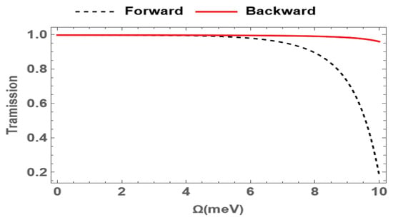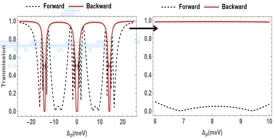Then, from Equation (9), the transmission of the probe field in the two reverse directions can be rewritten in the following form []: