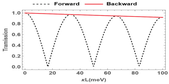 In what follows, we discuss variation in the transmission of the probe field with different penetration depths, which is the product of the propagation coefficient and the length of the medium L. The results are shown in Figure 5. It is found that the transmission of the forward probe field oscillates with the penetration depth in the forward direction, while the backward one decreases slightly with the increase in the penetration depth. The nonreciprocal effect reaches its maximum at . For this penetration depth, the forward transmission is , and the backward transmission is . This implies that the nonreciprocal effect can be enhanced by adjusting the medium length or the propagation coefficient in the system.