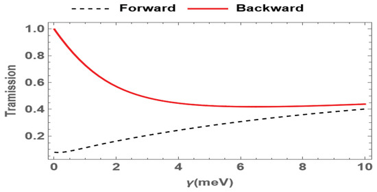 Transmission of the probe field for forward (red solid) and backward (black dashed) cases versus the decay rates, where the probe detuning is set to be meV. The other parameters are the same as in Figure 2.