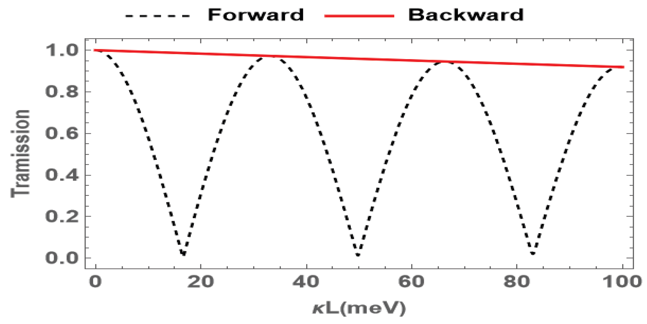 In what follows, we discuss variation in the transmission of the probe field with different penetration depths, which is the product of the propagation coefficient κ and the length of the medium L. The results are shown in Figure 5. It is found that the transmission of the forward probe field oscillates with the penetration depth in the forward direction, while the backward one decreases slightly with the increase in the penetration depth. The nonreciprocal effect reaches its maximum at κ L = 17 meV . For this penetration depth, the forward transmission is 0.037 , and the backward transmission is 0.985 . This implies that the nonreciprocal effect can be enhanced by adjusting the medium length or the propagation coefficient in the system.