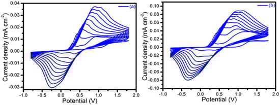During the electrochemical polymerization, characteristic peaks were observed in the voltammogram corresponding to the different redox states of the PANI@2D-MoSe2 composite. Figure 2a,b corresponded to CV curves of the PANI and PANI@2D MoSe2 composites. An anodic peak appeared at 0.3 V vs. Ag/AgCl, corresponding to the transition from the leucoemeraldine base (fully reduced form) to emeraldine salt (partially oxidized form). Another anodic peak was observed at 0.8 V vs. Ag/AgCl, indicating the transition from emeraldine salt to pernigraniline (fully oxidized form) [16].