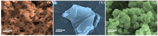 FE-SEM images of (a) PANI, (b) 2D-MoSe2, and (c) PANI@2D-MoSe2 composite.