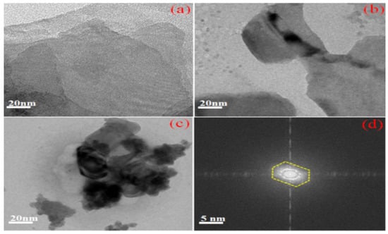 HR-TEM images of (a) PANI, (b) 2D MoSe2, (c) PANI@2D MoSe2, and (d) SAED pattern of PANI@2D-MoSe2 composite.