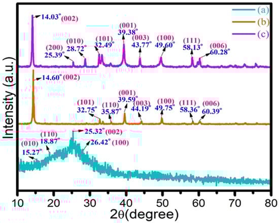 X-ray diffraction (XRD) pattern analysis was used to determine the crystalline nature of the PANI, 2D-MoSe2, and PANI@2D-MoSe2 composite. Figure 5a–c correspond to the XRD pattern of PANI, 2D MoSe2, and PANI@2D MoSe2. The XRD pattern of PANI (Figure 5b) appeared to be semi-crystalline in nature, with crystalline peaks observed at 2θ = 15.27°, 2θ = 18.87°, 2θ = 25.32°, and 2θ = 26.42°. These peaks also correlated to the crystalline planes of (010), (110), (002), and (100). The predominant peak at 2θ = 25.32° and the crystalline peak at (200) were associated with hydrogen bonds between polymer chains. The XRD pattern of 2D MoSe2 is shown in Figure 5b. Peaks appeared at 2θ = 14.60°, 32.75°, 35.87°, 39.59°, 44.14°, 44.75°, 49.75°, 58.36°, and 60.39°, corresponding to the 2D MoSe2, and crystalline planes were also observed at (002), (101), (110), (001), (003), (100), (111), and (006). The 2D MoSe2 XRD patterns exhibited octahedral structures. The peaks observed at 2θ = 14.03°, 25.39°, 28.72°, 32.49°, 39.38°, 43.77°, 49.60°, 58.13°, and 60.28° corresponded to the PANI@2D-MoSe2 composite, with crystalline planes also observed at (002), (200), (010), (101), (001), (003), (100), (111), and (006). Based on the XRD results, the polyaniline polymer was completely deposited on the MoSe2 sheets. The 2θ = 14.03°, 39.38°, and 60.28° peaks correspond to the 1-T phase of 2D MoSe2 in these XRD patterns, and the crystalline plane also appeared at (002), (101), (111), (103), (003), and (100). Figure 5c shows the XRD pattern for PANI@2D-MoSe2 [19,20]. During the electrochemical polymerization processes, the PANI polymer was completely inserted into the sheet-like structure of the two-dimensional MoSe2. After the insertion of polyaniline polymer into the molybdenum selenide, the semiconducting nature of the composites was reduced. The metallic nature of the octahedral phase was further increased and the crystalline nature of the as-prepared composites of PANI@2D-MoSe2 improved. The PANI and 2D MoSe2 were stacked with weak Van der Waals interactions between them.
