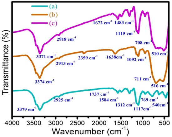 Fourier-transform infrared spectroscopy (FT-IR) is used to identify the presence of functional groups of the PANI, 2D-MoSe2, and PANI@2D-MoSe2 composite. The FT-IR spectra of the electropolymerized PANI are shown in Figure 6a. The peaks appeared at 3379, 2925, 1737, 1584, 1312, 1117, 769, and 540 cm−1, corresponding to the stretching vibrations of –NH2 and –CH3 groups, and the stretching vibrations of C=O, C-N, and -OH.