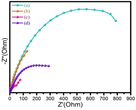 The electrical conductivity of the as-prepared PANI, 2D-MoSe2, and PANI@2D-MoSe2 composites were determined using electrochemical impedance spectroscopy (EIS) studies. EIS studies were used to determine the electrical conductivity of PANI, 2D MoSe2, and PANI@2D MoSe2 composite CEs. Figure 7a illustrates the EIS spectrum of electropolymerized PANI, showing the higher semicircle portion. This kind of semicircle portion indicates lower electrical conductivity. Figure 7b shows the EIS spectrum of 2D MoSe2, with Nyquist plots showing the higher semicircle portions. Figure 7c shows the EIS spectrum of the PANI@2D MoSe2 CE, which exhibits a lower semicircle portion and lower-frequency regions.
