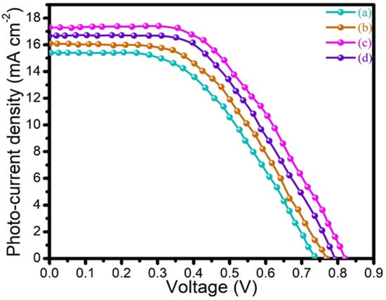 The I–V curves of the PANI NF and 2D MoSe2 sheet CEs are presented in Figure 8a,b. The DSSC device fabricated with the PANI NF CE achieved 5.07% efficiency, while the 2D MoSe2 sheet CE achieved an efficiency of 5.82%. The DSSC device using the Pt CE achieved an efficiency of 6.61%. The PANI@2D MoSe2 CE achieved a higher efficiency of 7.38% due to the higher electrical conductivity of the PANI covering the metallic nature of the octahedral phase of the 2D MoSe2. The carbon-based materials of the PANI combined TMCs, further improving the surface active area of CE and providing better interfacial contact between the CE and electrolyte interface, faster regeneration of iodide/tri-iodide redox couple, and reducing the recombination rates of the CE. The increasing current and potential of the device increased the fill factor of the device. Increasing the fill factor of the device always increases the efficiency of the device. The I–V curves of the PANI@2D MoSe2 and Pt CEs are presented in Figure 8c,d [23,24].