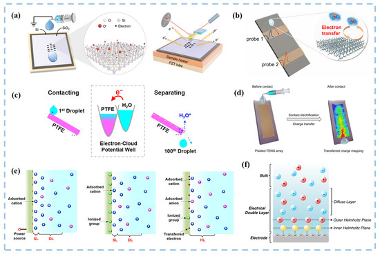 - Zhan, F.; Wang, A.C.; Xu, L.; Lin, S.; Shao, J.; Chen, X.; Wang, Z.L. Electron Transfer as a Liquid Droplet Contacting a Polymer Surface. ACS Nano 2020, 14, 17565–17573. [Google Scholar] [CrossRef]