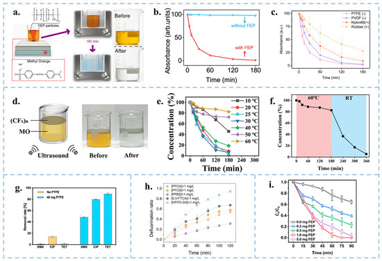 (a) Schematic diagram of the experimental device and scheme for the ultrasonic degradation of MO by FEP powder. (b) Changes in absorbance of MO solution with/without FEP powder. (c) Variation of UV-Vis absorbance of MO solution during ultrasonic treatment with PTFE, PVDF, Nylon-6,6 and NBR rubbers, respectively. Reproduced with permission from [17], Nat. Commun.; published by Nature, 2022. (d) Schematic diagram of the device for ultrasonic degradation of MO by fluorinated graphite. (e) Ultrasonic degradation of MO by fluorinated graphite concentration at different temperatures. (f) The catalytic efficiency of (CFX)n was restored as before when the temperature was lowered from high to room temperature. Reproduced with permission from [89], Adv. Funct. Mater.; published by Wiley, 2024. (g) Removal rates of 1 mg/L SMX, CIP and TET solutions with/without PTFE particles. Reproduced with permission from [90], Chem. Eng. J.; published by Elsevier, 2024. (h) Defluorination of solutions of different PFAS compounds by ultrasonication of PTFE particles. Reproduced with permission from [91], Angew. Chem. Int. Ed.; published by Wiley, 2024. (i) Concentration changes in ultrasonic degradation of pentachlorophenol by different masses of FEP. Reproduced with permission from [92], ACS EST Eng.; published by ACS, 2024.