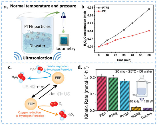 (a) Schematic diagram of the device for ultrasonic generation of H2O2 from PTFE particles in DI water. (b) Comparison of H2O2 yield prepared from PTFE and Polyethylene (PE) pellets under different time of sonication. Reproduced with permission from [20], Adv. Mater.; published by Wiley, 2023. (c) Schematic diagram of the mechanism of H2O2 generation by sonication of FEP powder in DI water. (d) Comparison of H2O2 yield of FEP, PTFE, PVDF and HDPE under ultrasonication. Reproduced with permission from [21], Nanoscale; published by RSC, 2023.