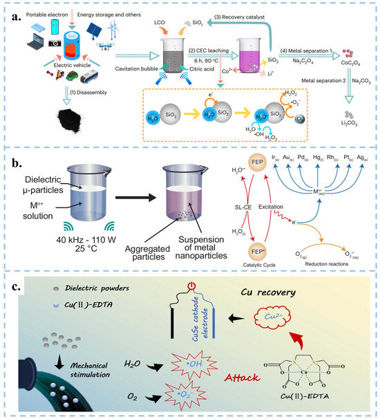 Compared to traditional methods of reducing metals, Wang et al. proposed a new approach using CEC instead of traditional reducing agents in organic acid leaching processes, which reduced lithium, cobalt, nickel, and manganese from discarded lithium batteries [94], and reduced precious metals at room temperature and pressure [95]. Specifically, recyclable Hydrophobic SiO2 powder served as a catalyst to stimulate continuous solid-liquid contact-separation through cavitation bubbles under ultrasonication, resulting in the continuous generation of ROS. The results revealed that in the case of lithium-cobalt (III) oxide batteries, the leaching efficiency reached 100% for Li and 92.19% for Co within 6 h at 90 °C. Meanwhile, for Li ternary batteries, the leaching efficiencies were 94.56% for Li, 96.62% for Ni, 96.54% for Mn, and 98.39% for Co at 70 °C (Figure 7a) [94]. FEP particles can be used to extract precious metal nanoparticles from aqueous solutions at room temperature, as well as gold from CPU leaching solutions and electroplating waste (Figure 7b) [95]. Similarly, Shen et al. achieved the degradation of Cu (II)-EDTA and the recovery of Cu2+ using FEP dielectric powder combined with capacitive deionization (CDI), with a degradation rate of 86.4% within 150 min (Figure 7c) [96]. Therefore, the CEC method provides a green, efficient, and economical approach for metal recycling, effectively meeting the exponential growth demand of industrial scale production.