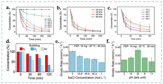 (a–c) Degradation of MO solution by FEP powder under different conditions (power, frequency and temperature). Reproduced with permission from [113], Nano Energy; published by Elsevier, 2022. (d) The influence of dissolved gas in solution on the degradation of MO. Influence of (e) the salt concentration (NaCl) and (f) the pH on the kinetic rate of the production of H2O2. Reproduced with permission from [21], Nanoscale; published by RSC, 2023.