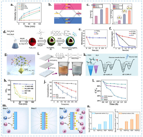 (a) UV-Vis absorbance intensity of WST-1 formazan dye during different ultrasonic with functional group modified membrane. Reproduced with permission from [115], Nano Res.; published by Springer, 2024. (b) Schematic diagram depicting the influence of the strength of orbital hybridization strength on the energy of the hybrid orbitals. (c) The charge output and kinetic rate of MO degradation of untreated FEP, FEP-O2, and FEP-CF4. Reproduced with permission from [28], Adv. Funct. Mater.; published by Wiley, 2024. (d) Synthesis process of magnetic Fe3O4@SiO2-F nanoparticles. (e,f) CEC performance under different conditions (material, functional group) for the degradation of MO. Reproduced with permission from [116], Nano Energy; published by Elsevier, 2023. (g) Degradation process of PY-MOF in water. (h) Concentrations of MOF and MOF (-PY, -NH2) degrading MB with time. Reproduced with permission from [121], Nano Energy; published by Elsevier, 2023. (i) Device and process of FEP film CEC degradation of MO and SEM image of FEP films etched by ICP for different times. (j) Concentration of ultrasonically degraded MO in membranes after FEP and ICP etching over time. Reproduced with permission from [22], Nat. Commun.; published by Nature, 2024. (k) Schematic diagram of the principle of a polarizer. (l) Comparison of the roles of polytetrafluoroethylene (PTFE) and the internal electric field in MO dye degradation. Reproduced with permission from [122], J. Am. Chem. Soc.; published by ACS, 2024. (m) Schematic diagram of the catalytic principle of the polymer/metal Janus composite catalyst. (n) The amount of free radicals generated by metal, polymer, metal-polymer, and polymer/metal Janus composite catalysts, respectively. Reproduced with permission from [123], Nano Energy; published by Elsevier, 2023.