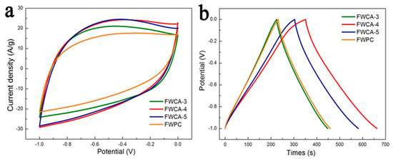 (a) The cyclic voltammetry (CV) and (b) galvanostatic charge–discharge (GCD) curves of the FWCAs and FWPC. A 6 M KOH electrolyte solution in a three-electrode system was used. The scan rate of the CV curve was 100 mV/s, and the current density measured by the GCD plot was 1 A/g.
