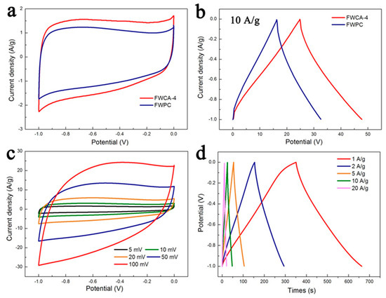 The CV exhibited significant deformation at a scan rate of 100 mV/s (Figure 6c), but maintained good symmetry, indicating that FWCA-4 had fast ion diffusion and good charge-propagation properties [15]. The specific capacitance of FWCA-4 was 314.4 F/g at 1.0 A/g according to the GCD plot shown in Figure 6d. When the current density increased from 1.0 to 20.0 A/g, although the voltage drops at the beginning of the discharging process increased (from 0.008 to 0.15 V), the GCD curve maintained a good triangular structure, indicating that the electrode had good electrical double-layer capacitance behavior and good reversible capacitance.