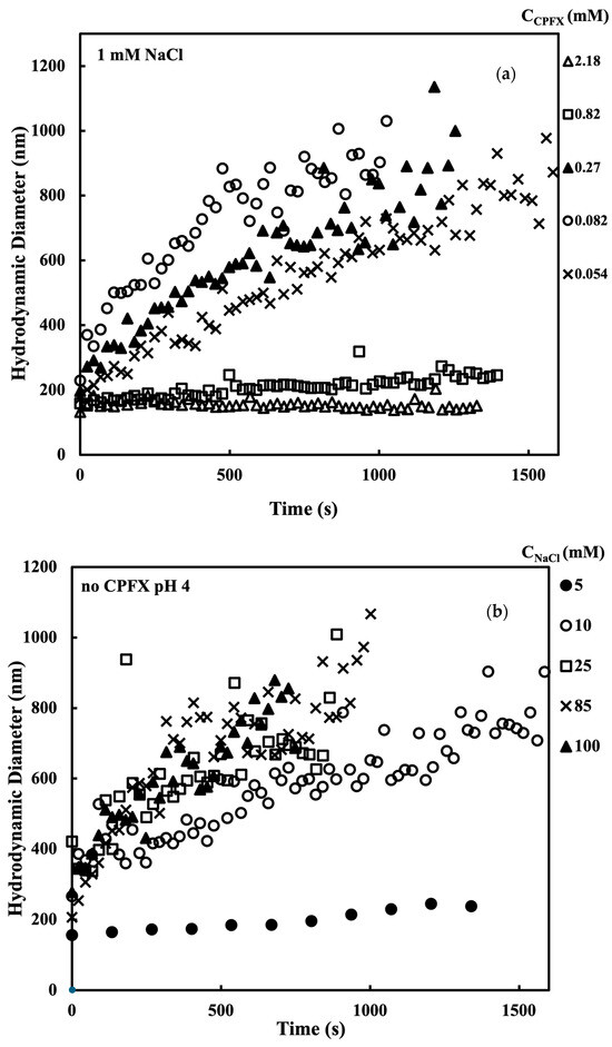 The hydrodynamic diameter vs. time curves with various CPFX and salt concentrations are shown in Figure 7. As shown in Figure 7a, when the concentration of CPFX was higher than 0.109 mM, the hydrodynamic diameter of the MMT increases with time, resulting in the increased size over 1000 nm at certain conditions. The initial aggregation rate of MMT also increased with increasing the concentration of CPFX and then reached the maximum. However, when the concentration of CPFX is around 1.63 mM, the hydrodynamic diameter of MMT remains constant at 150 nm to 180 nm. The result showed that the higher CPFX concentration would interfere with the aggregation of MMT. In this study, the initial aggregation rate given in ()t→0 is used to obtain the stability ratio W, as shown in Equation (6). This notation represents the derivative of dh with respect to t, evaluated as t approaches 0. The relationship between the hydrodynamic diameter and time was fitted with a third polynomial equation, and the coefficient of the first-order term of the equation was extracted to represent the initial slope ()t→0. Figure 7b–d also shows a plot of the size vs. time at different NaCl concentrations without CPFX. The degree of increase in MMT size at different pH conditions appears to be related to the NaCl concentration, suggesting that higher ionic strength promotes aggregation [34]. A similar trend is seen at pH 4 and pH 6, where the hydrodynamic diameter of MMT increases with the increasing NaCl concentration. At pH 10, however, the increase in MMT size is more pronounced at higher concentrations (e.g., NaCl solution is 300 mM and above) compared to lower concentrations. Similar to the explanation for Figure 3, the higher magnitude of net surface charge of MMT at pH 10 likely contributes to increased electrostatic repulsion, making it necessary to require greater ionic strength for the screening of double-layer repulsion.