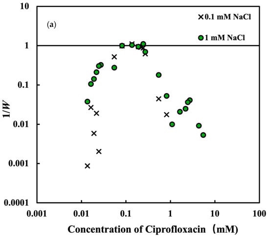 To look further into the aggregation mechanism of MMT in the presence and absence of CPFX, the inverse stability ratio 1/W of MMT vs. the concentrations of CPFX and NaCl concentration are shown in Figure 8. The different symbols represent different conditions. The inverse stability ratio 1/W of MMT without CPFX under different pH condition shows the increasing trends with increasing the concentration and reaches the constant over a critical concentration. The stability ratio W is defined as Equation (6), where is the in the fast aggregation regime attained at higher NaCl concentrations. The lowest electrolyte concentration necessary for the fast aggregation of colloidal particles in a suspension is known as the critical coagulation concentration (CCC). Generally, in the slow aggregation regime, the aggregation rate increases with increasing the electrolyte concentration, which indicates that the van der Waals attractive force gradually becomes dominant. With the increase in electrolyte concentration over the CCC, the aggregation rates become constant due to the screening of the electric double layer. In that condition, the aggregation rate of particles is independent of the salt concentration. In the presence of CPFX at a pH of 4, with increasing the CPFX concentration, the value of 1/W increases, reaches the maximum, and decreases as shown in Figure 8a. In this case, when the CPFX concentration is initially increased, CPFX can adsorb onto the MMT surface, partially neutralizing the surface charge and thus reducing electrostatic repulsion between particles, making the particles aggregate. The aggregation of MMT in the presence of CPFX under a pH 4 condition also displays the fast and slow aggregation regions of MMT. Compared to the salt induced coagulation, the CCC of CPFX is much smaller. According to the DLVO theory, a high NaCl concentration induces aggregation by the compression of the double layer. CPFX induces aggregation by the charge neutralization, as shown in Figure 4. As the concentration of CPFX increases, the repulsive force becomes weaker due to the charge neutralization. Consequently, MMT aggregates. With increasing the concentration of CPFX, the charge reversal is strong and the repulsive force becomes stronger, resulting in a slower aggregation rate. As a result, re-stabilization is observed at a high concentration of CPFX.