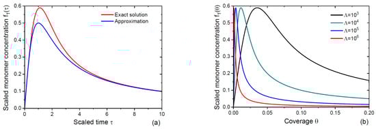 Figure 1. (a) Scaled monomer concentration f 1 = Λ n 1 versus scaled time τ as given by Equations (29) (exact solution) and (30) (approximation). (b) Scaled monomer concentration f 1 Λ θ given by Equation (29) versus coverage θ at different Λ shown in the legend. The monomer concentration, and hence the nucleation rate, become sharper and more asymmetric for larger Λ .